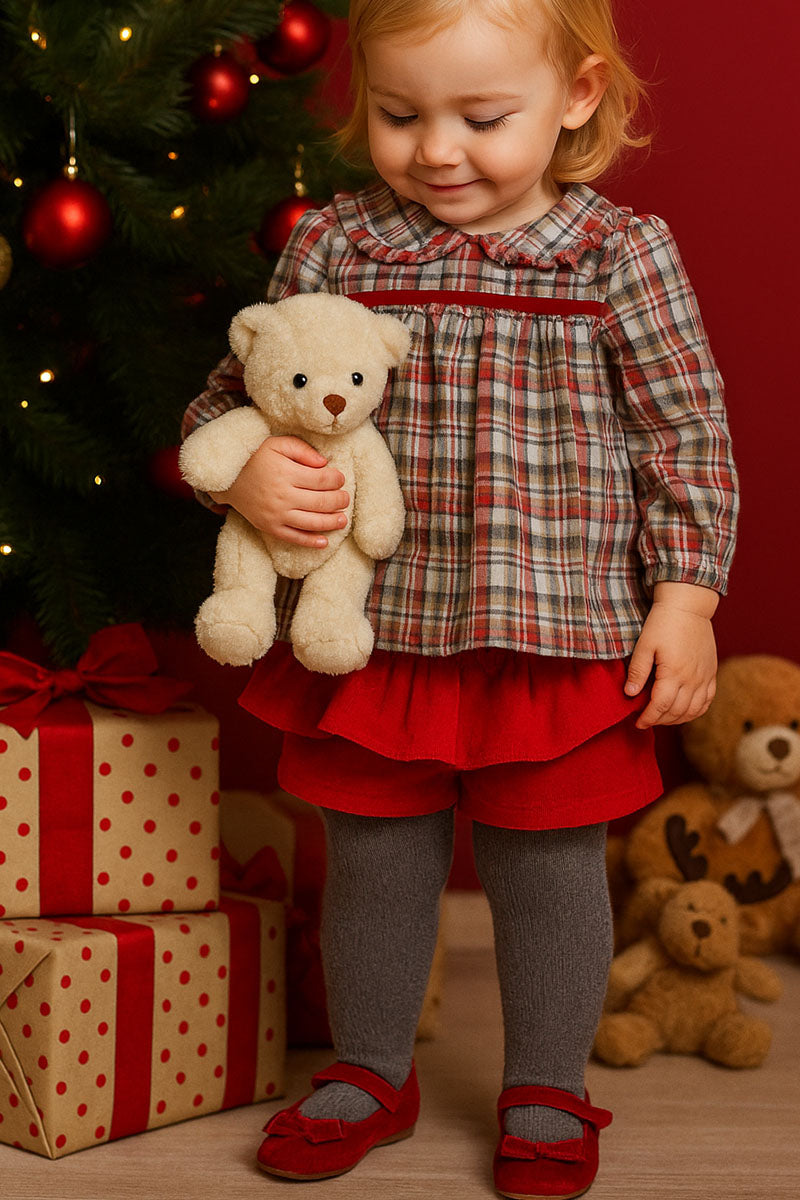 Completo 2 pezzi : camicina in flanella scozzese con colletto + short in vellutino millerighe con balza