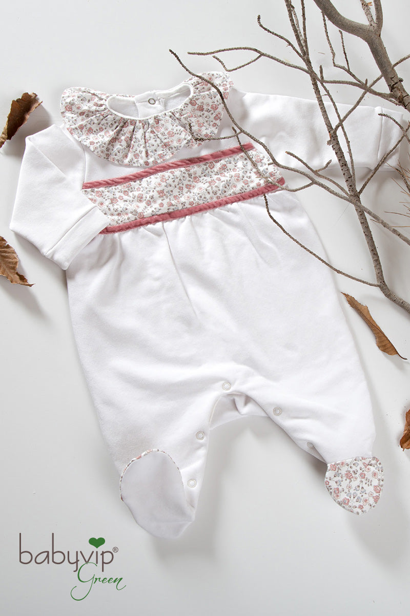 Tutina in felpa garzata organica inserti in cotone organico fantasia floreale e nastrini in velluto