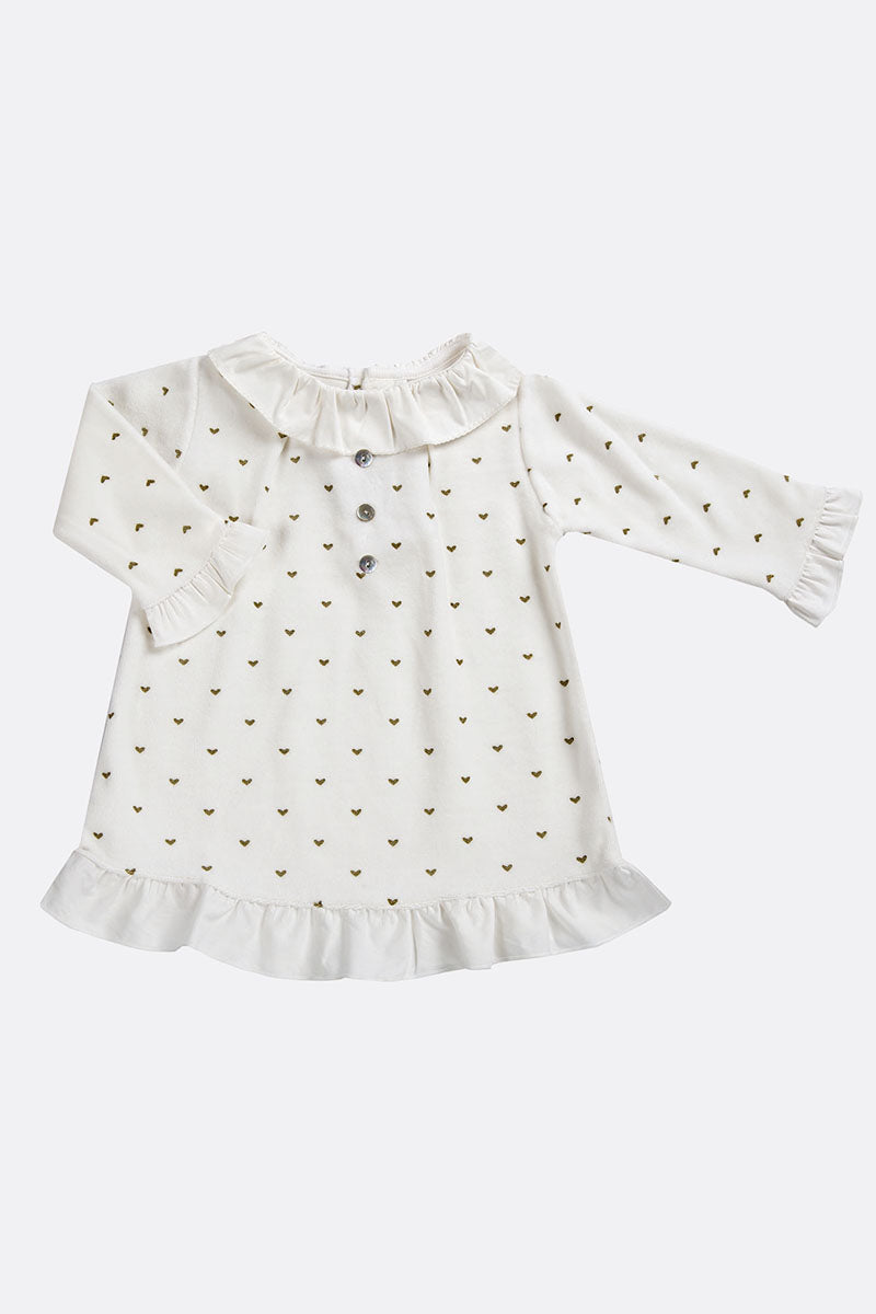 Vestitino in ciniglia con cuoricini in oro e rouches in tela