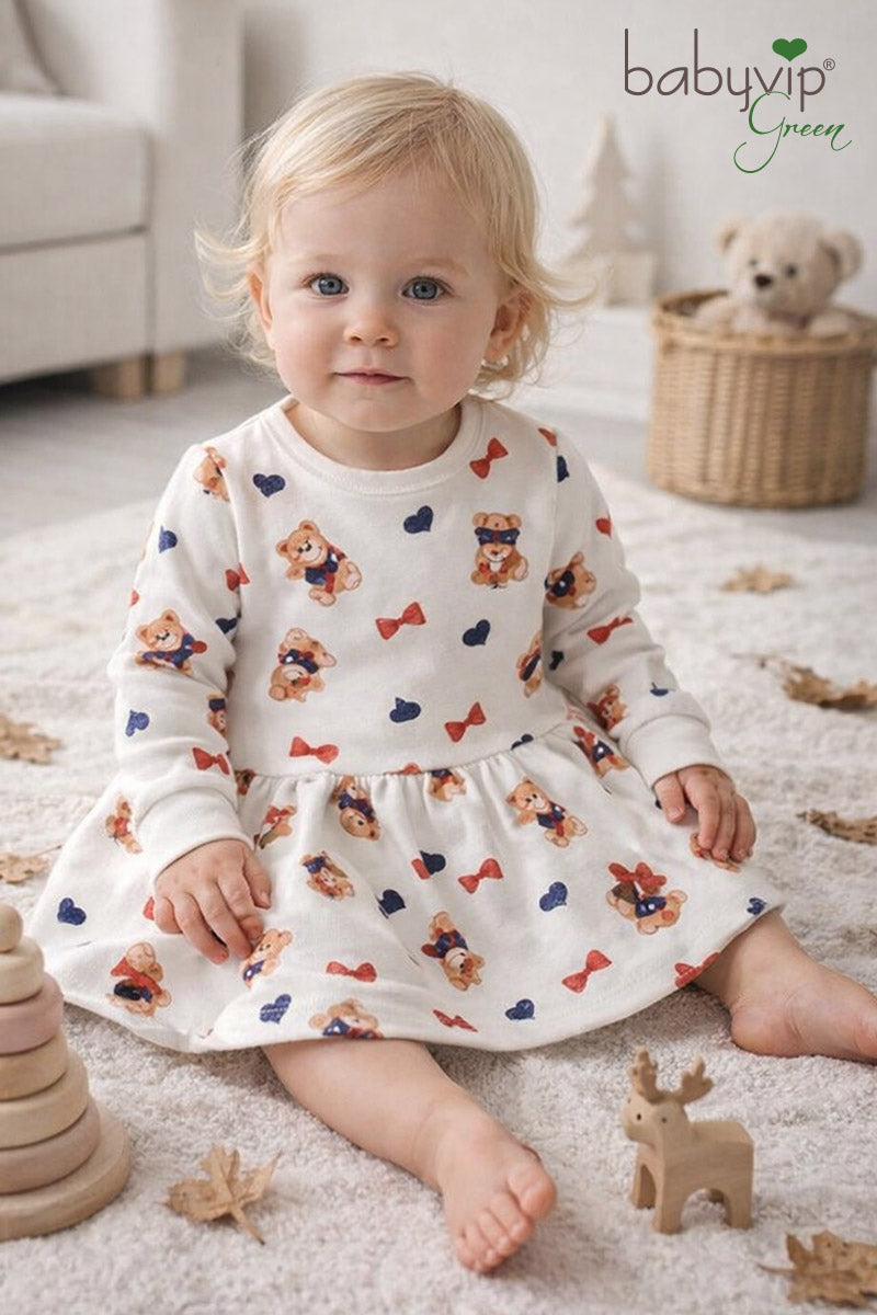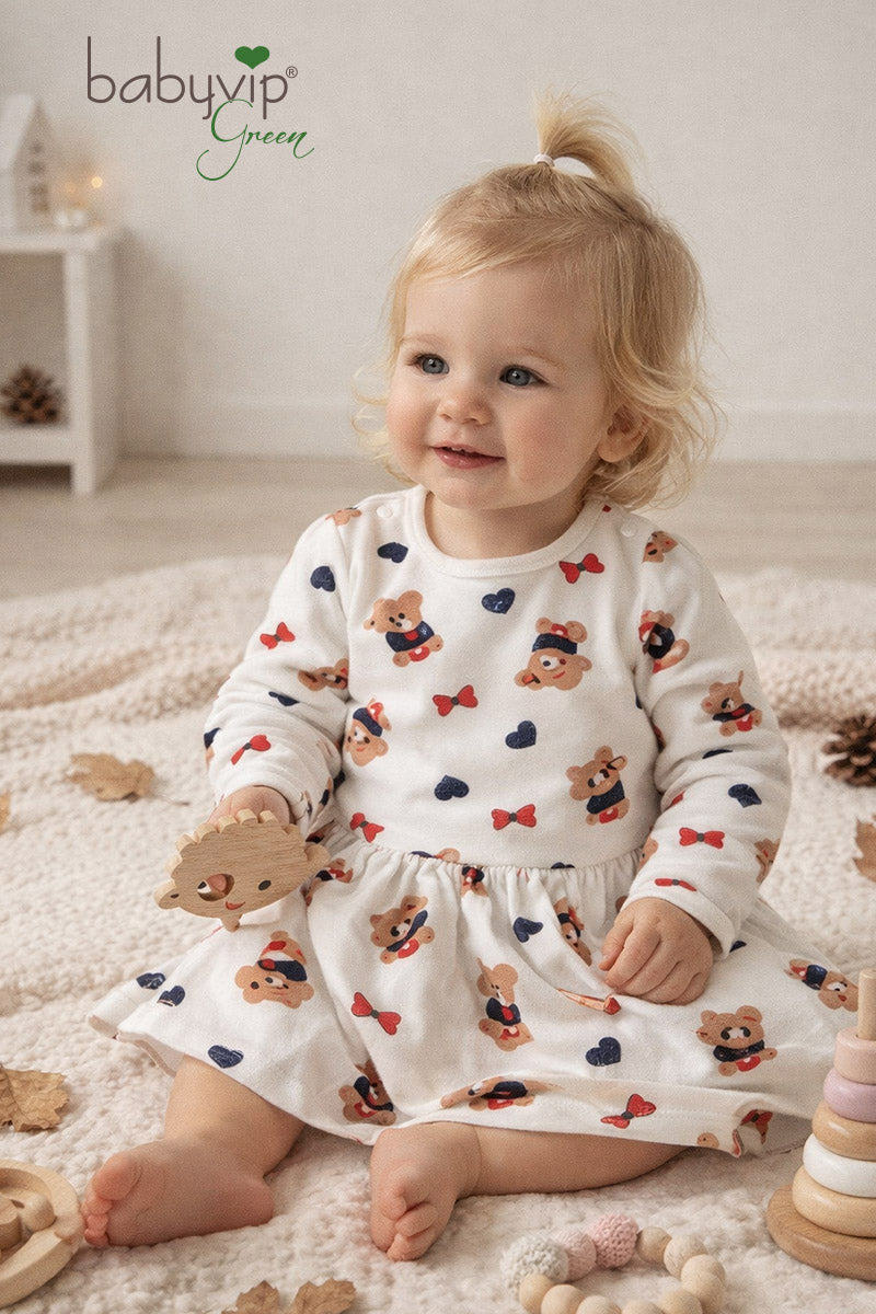 Vestitino neonata in felpa organica garzata fantasia orsetta con taglio e arricciatura