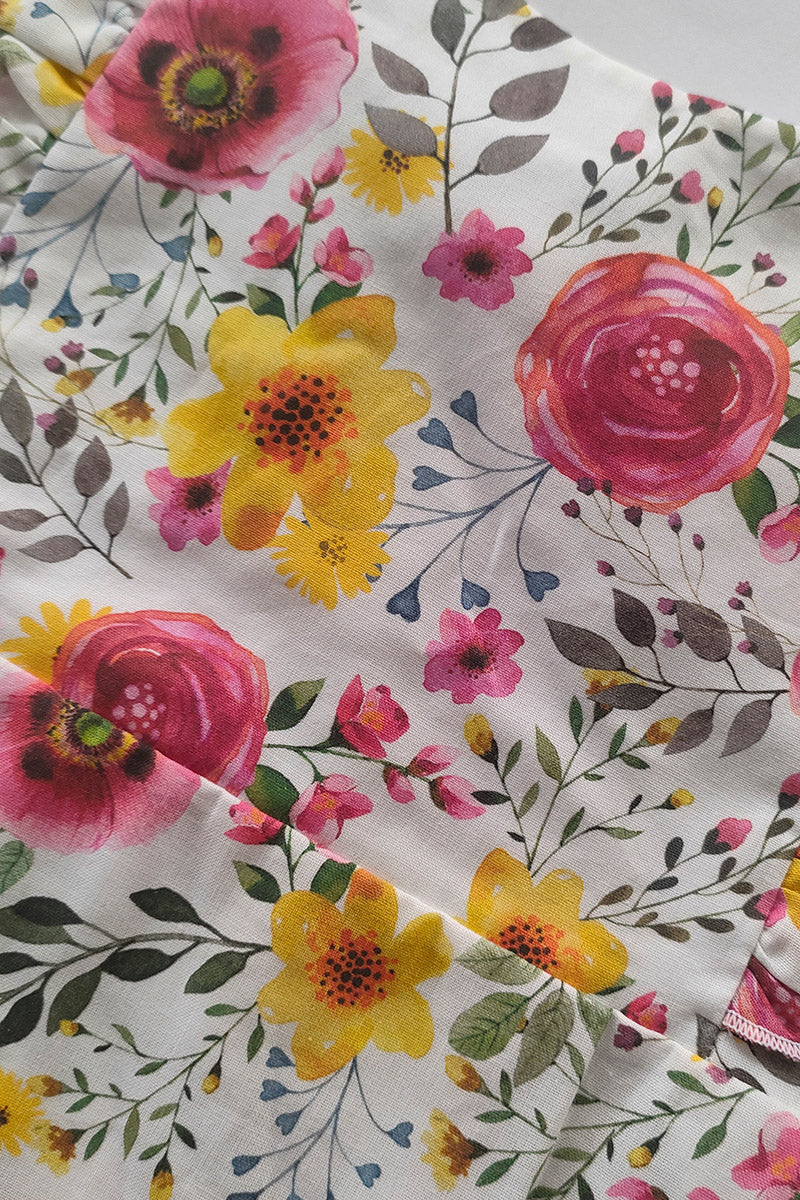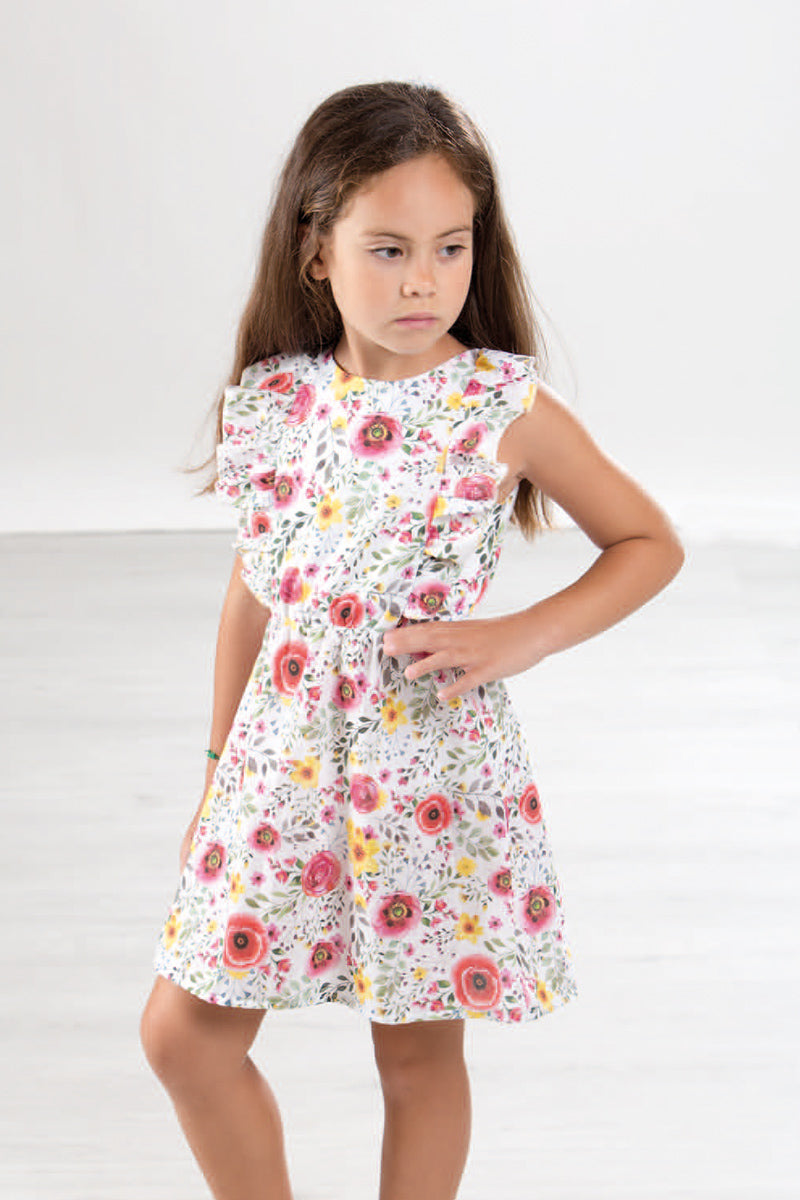 Vestitino in tela di cotone fantasia floreale con balze e oblò sul retro