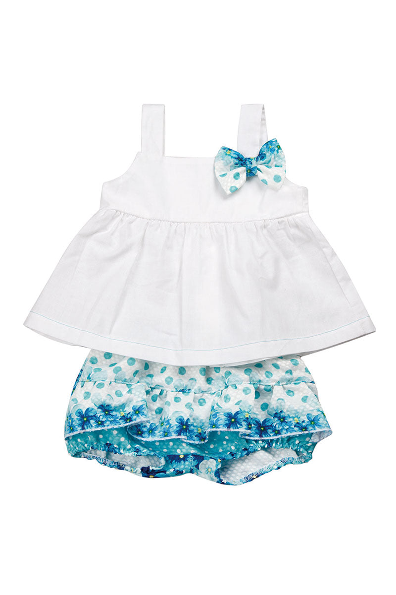 Completo 2 pezzi in tela di cotone con inserti in tessuto operato fantasia floreale e fiocco applicato