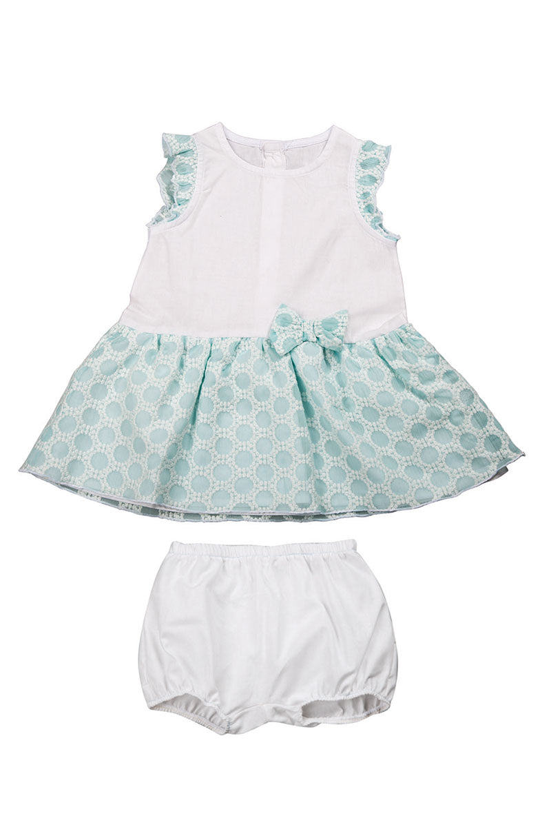 Vestitino in tela di cotone con inserti in tessuto operato e fiocco + mutandina