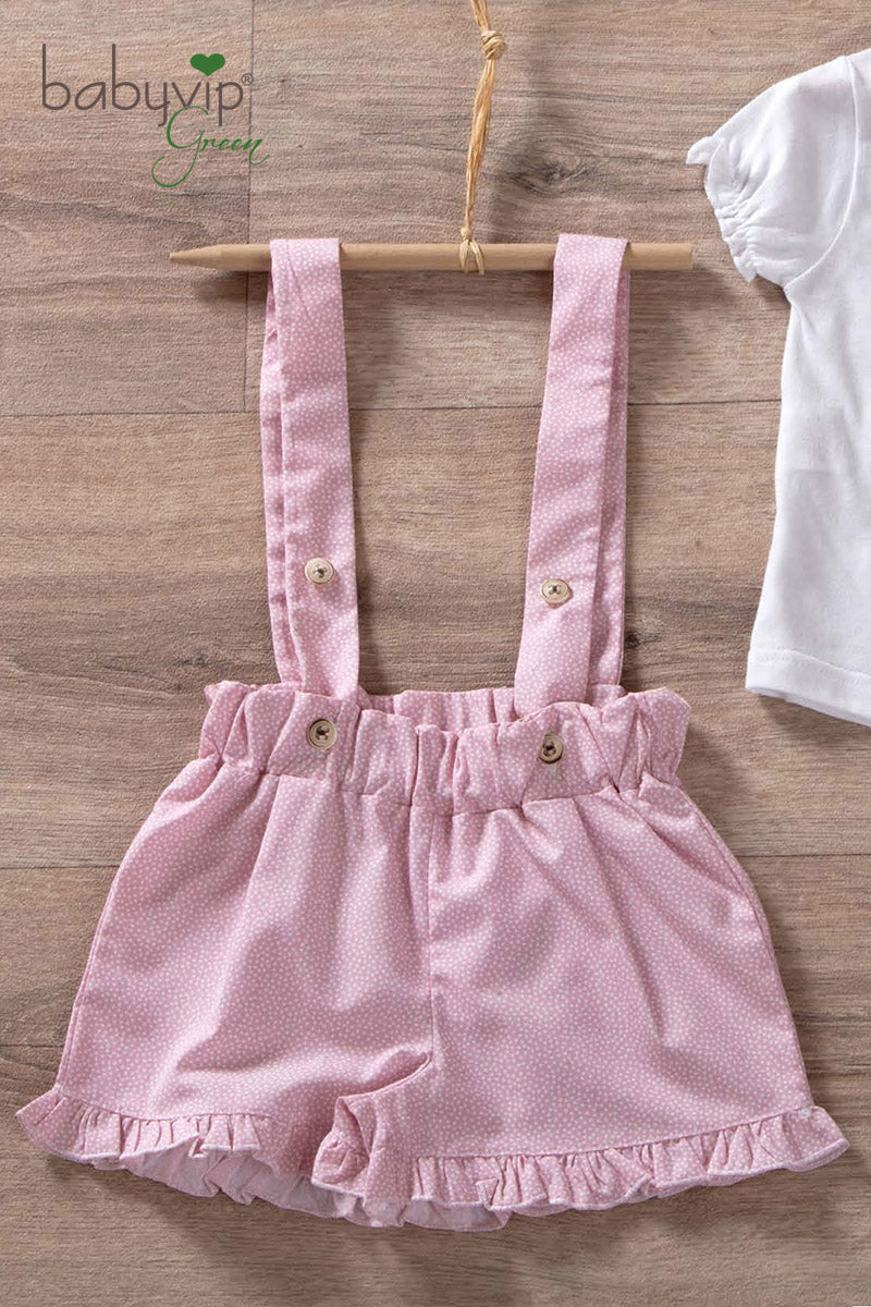 Pantaloncino con bretelle in tela di cotone organico con rouches