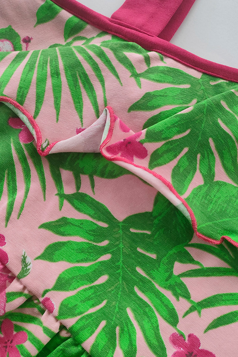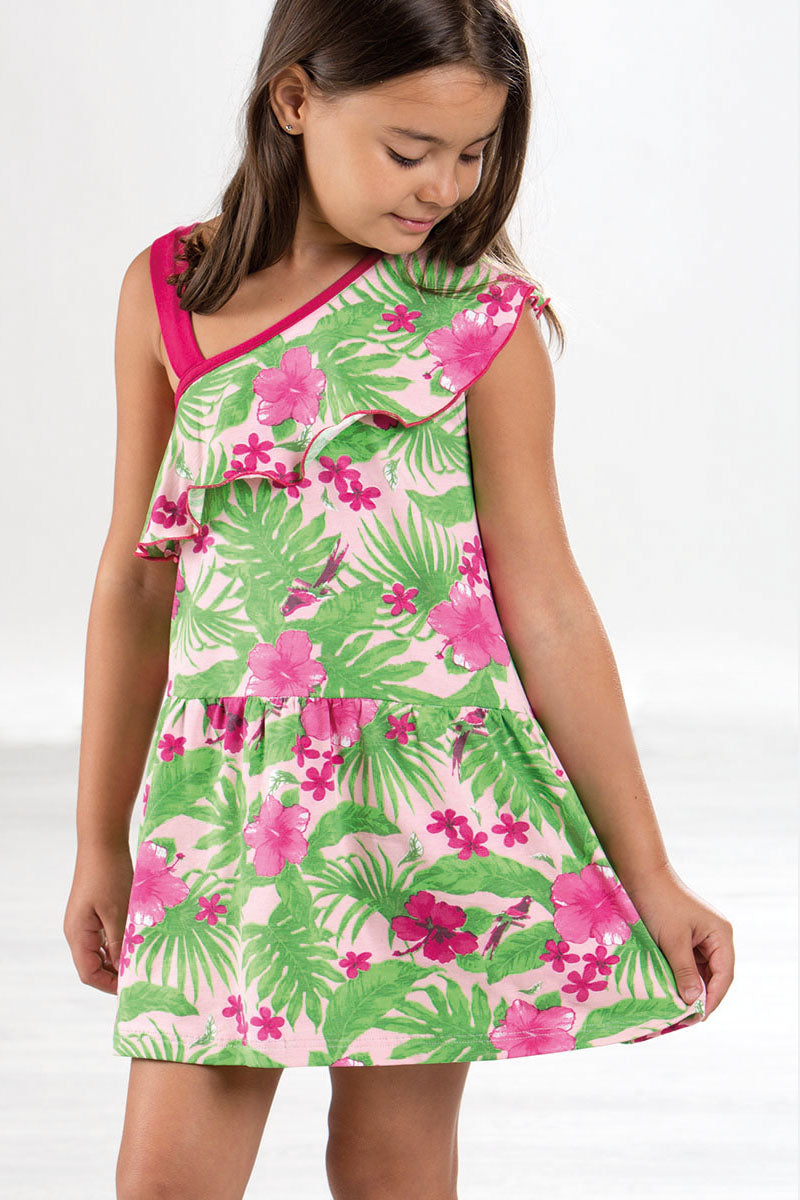 Vestitino in cotone elasticizzato monospalla fantasia floreale con balza e bretella in contrasto