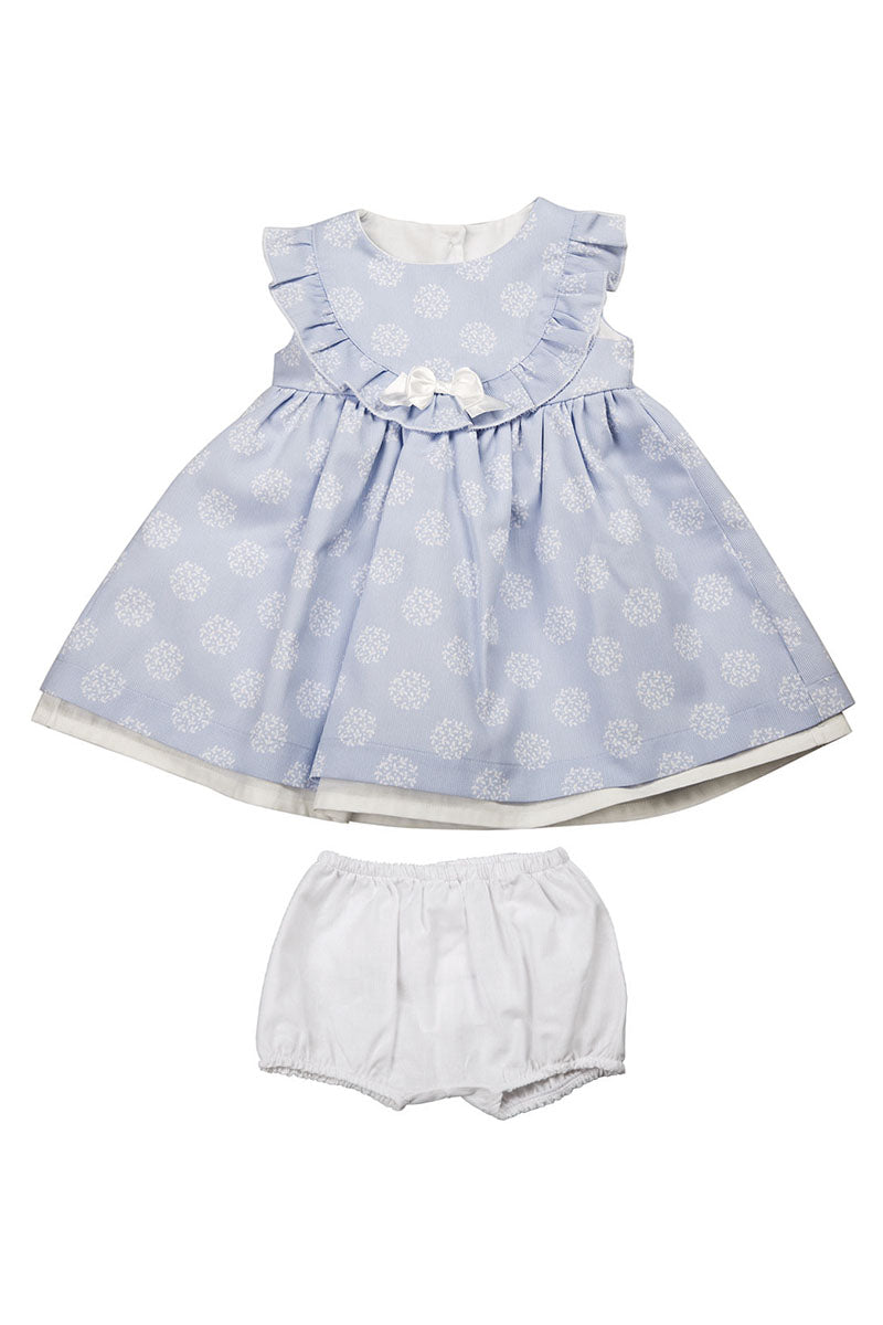 Vestitino in tela di cotone a navetta fantasia con balza e fiocco + mutandina in tela di cotone