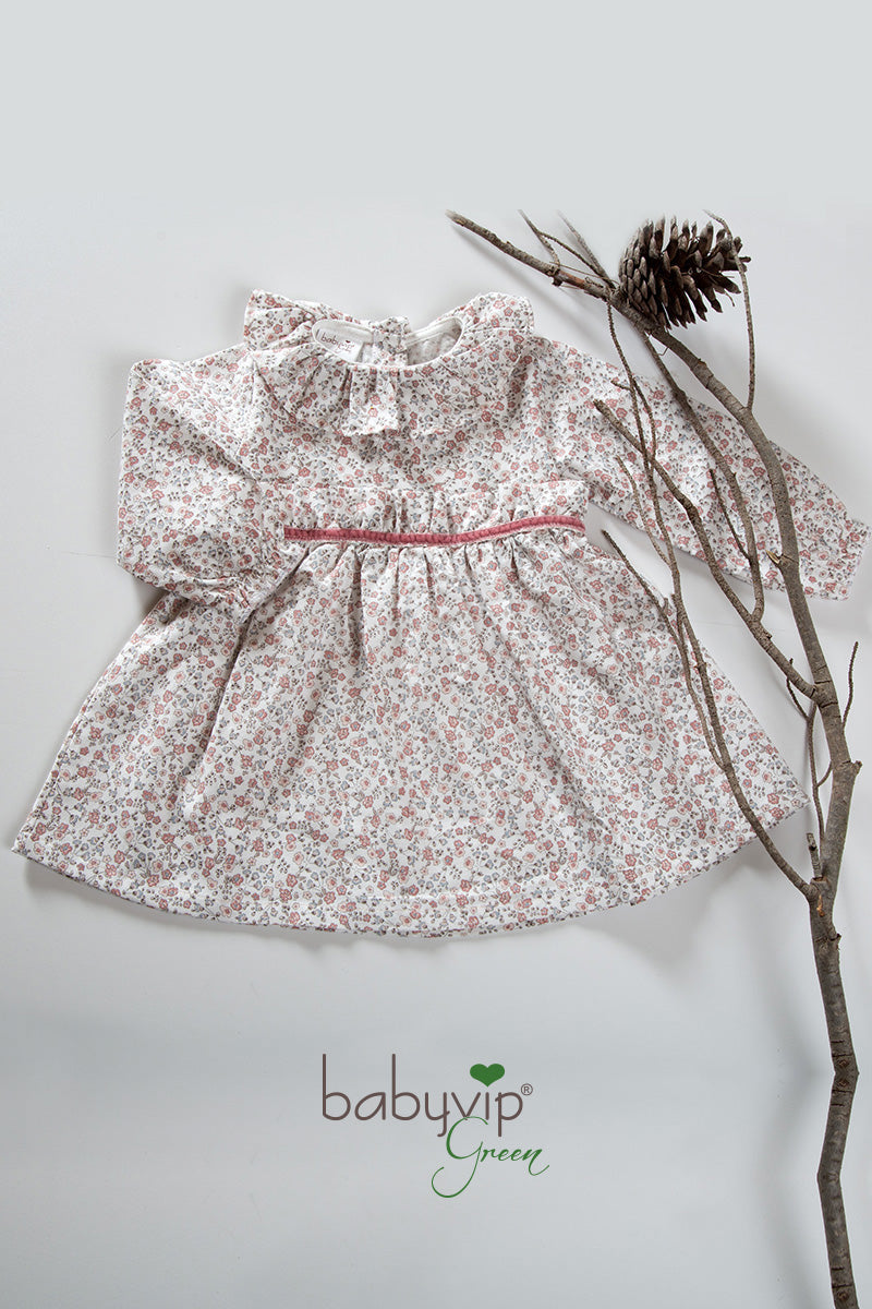 Vestitino in cotone organico fantasia floreale con balza allo scollo, maniche a sbuffo, taglio con rouches e nastrino in velluto in contrasto