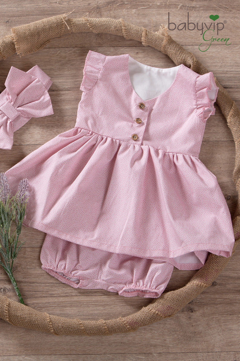 Vestitino in tela di cotone organico con fantasia micro pois e scollatura a V