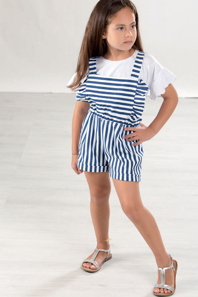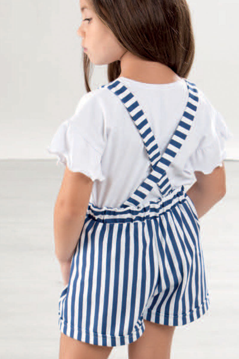 Salopette a pantaloncino in felpina rigata con balze e risvolti + t-shirt in jersey cotone con balze