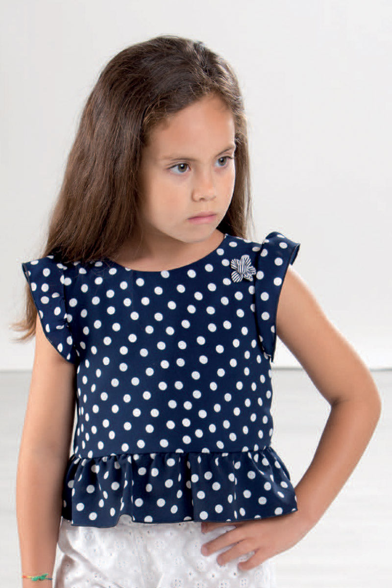 Blusa crepe a pois con balza ed alette arricciate, applicazione e retro con scollatura a “v” e fiocco applicato