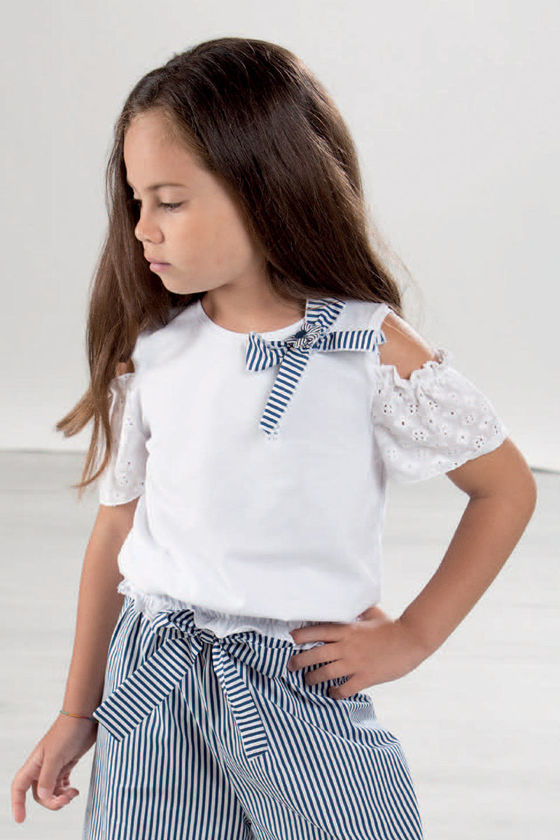 Maglia in cotone elasticizzato con maniche in tela sangallo, fiocco in tela rigata ed applicazione