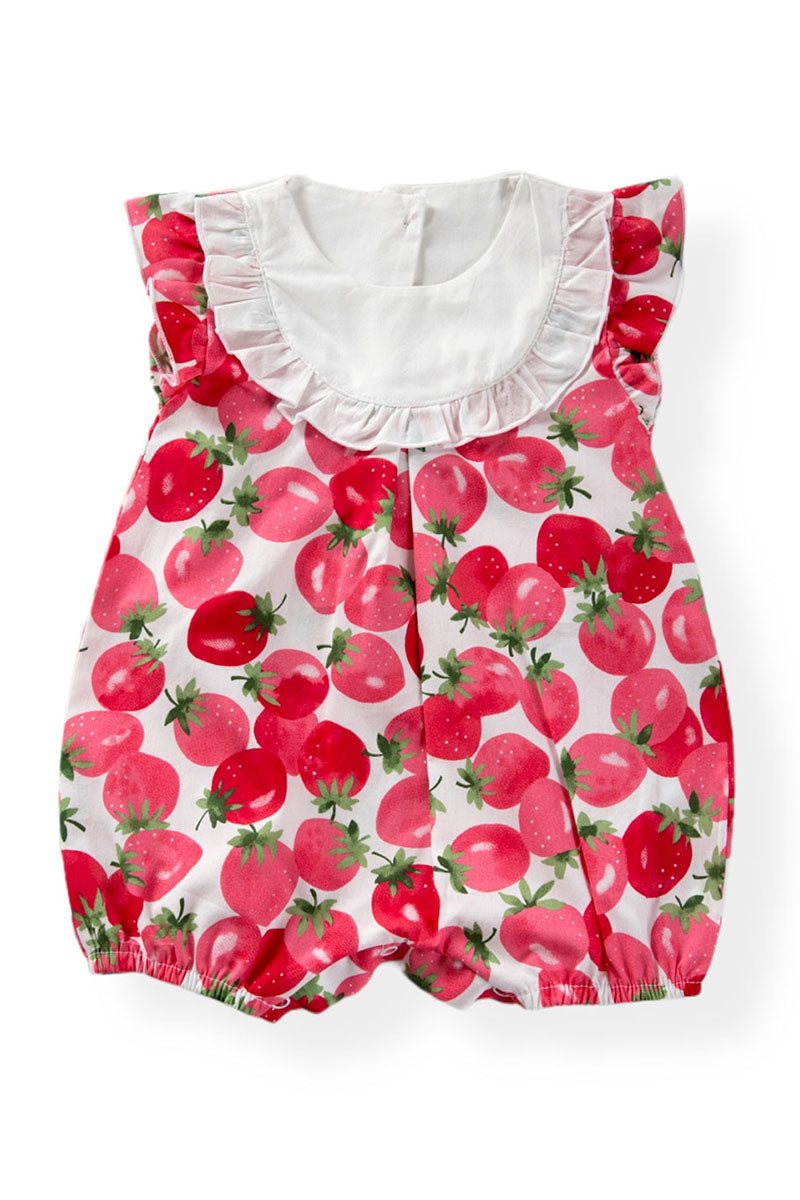 Pagliaccetto in tela di cotone organico fantasia fragole con taglio carrè e balza
