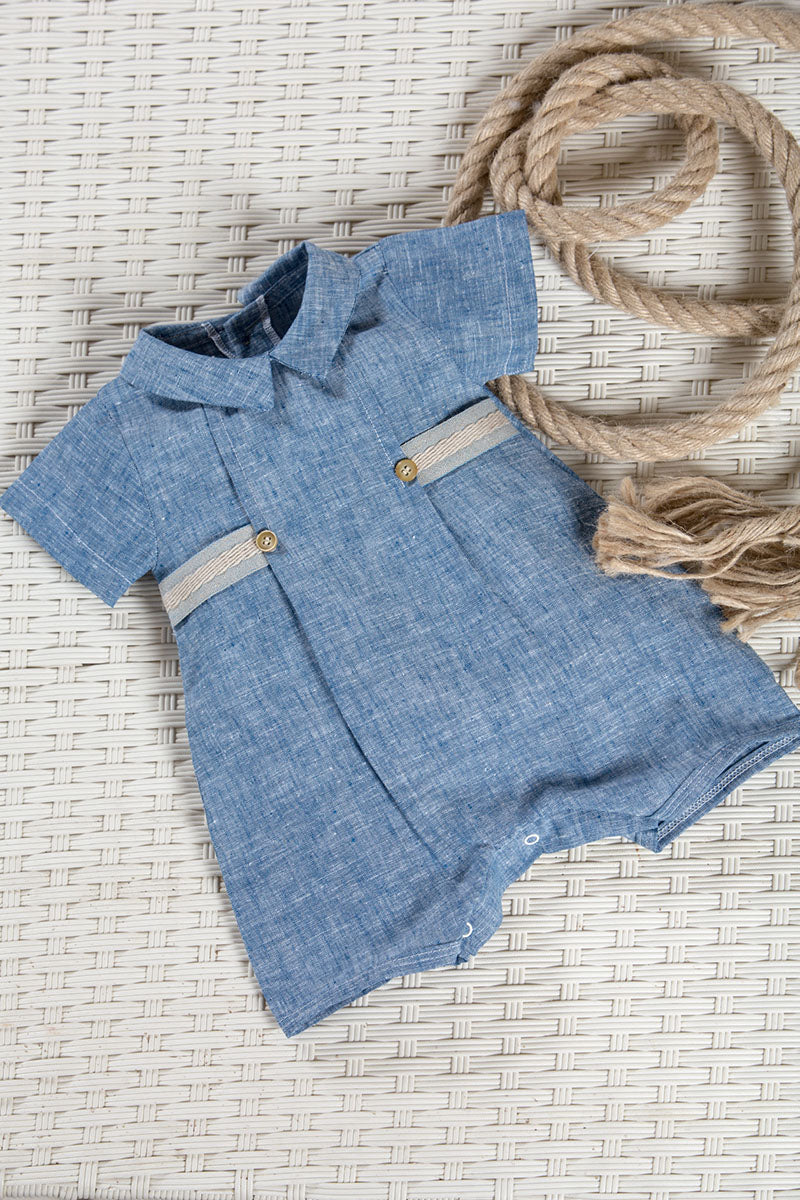 Pagliaccetto in tela effetto lino con pieghette, bottoncini e nastro in lino applicato