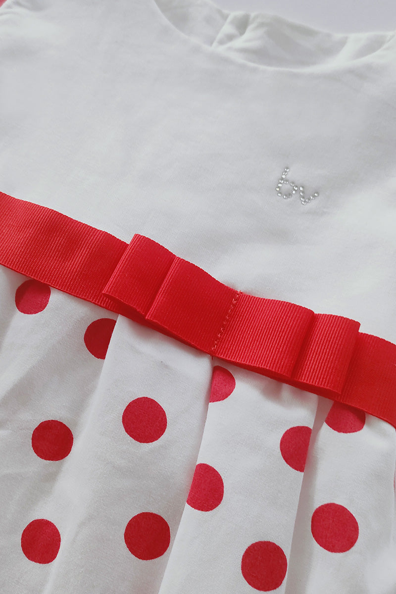 Pagliaccetto mezza manica in cotone fantasia pois con nastro in gros grain e stras