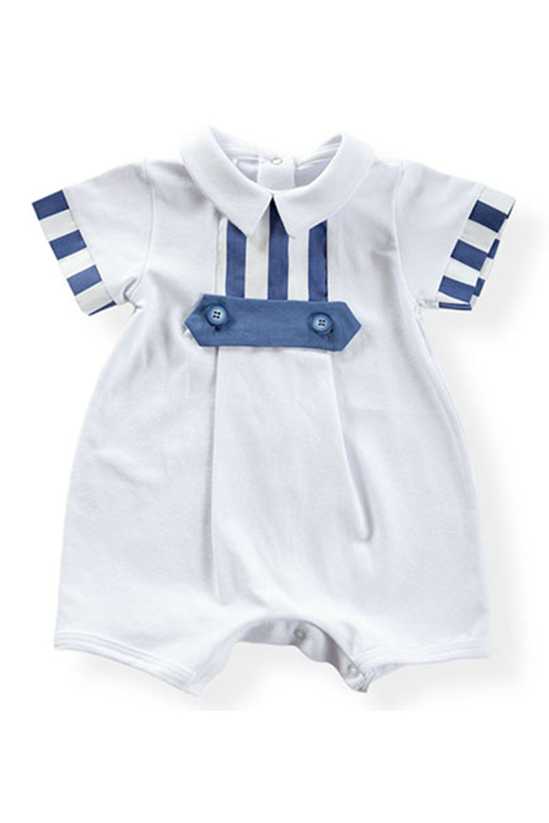 Pagliaccetto mezza manica in cotone elasticizzato con inserti in tela rigati, pattina e bottoni in contrasto