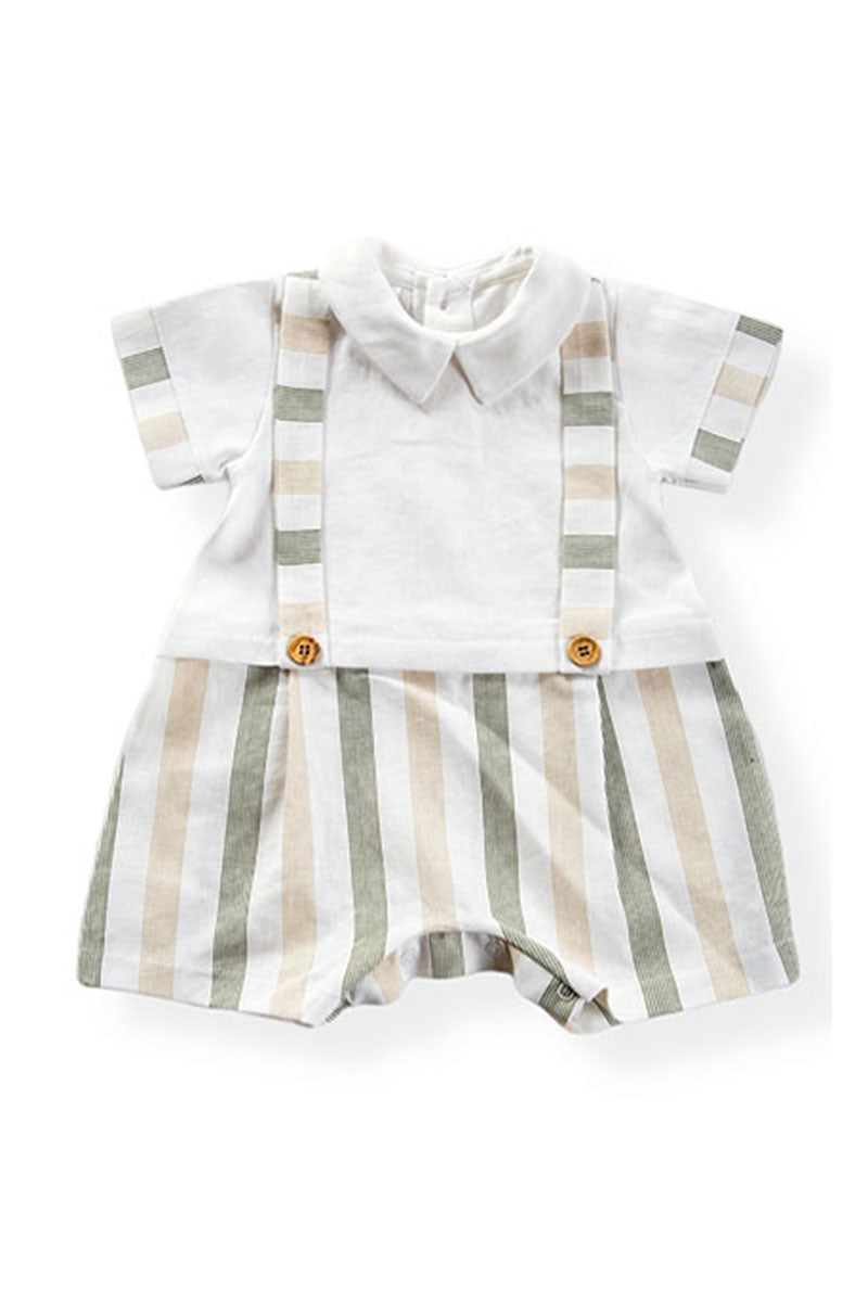 Pagliaccetto in tessuto effetto lino con bretelle e inserti rigati + bottoni in contrasto effetto legno