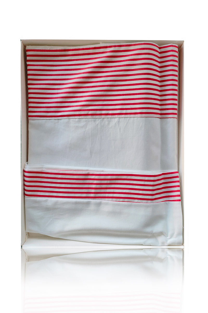 • Set 3 pezzi: lenzuola sopra e sotto con ricamo e federa;
