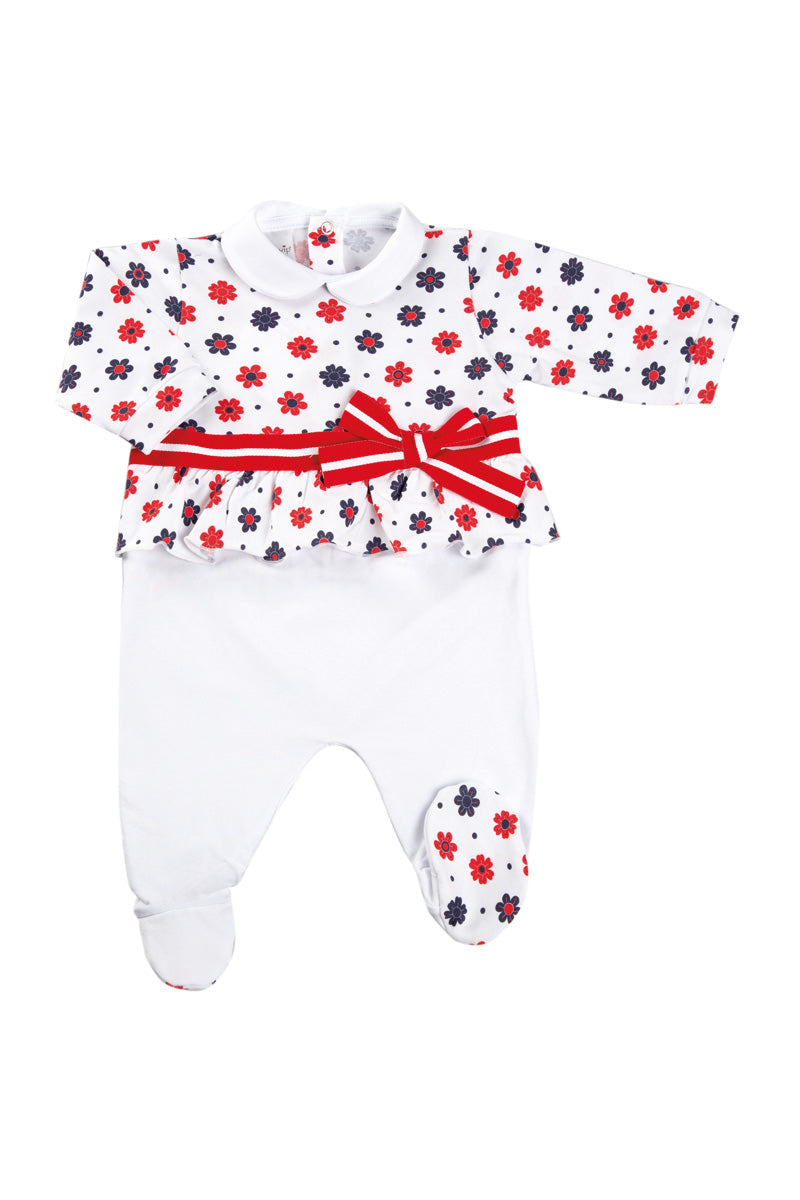 Tutina fantasia floreale con nastro, fiocco e balza arricciata.