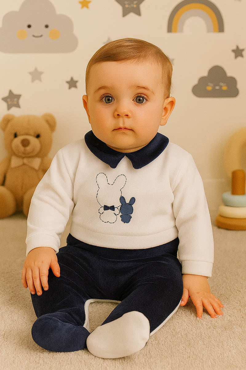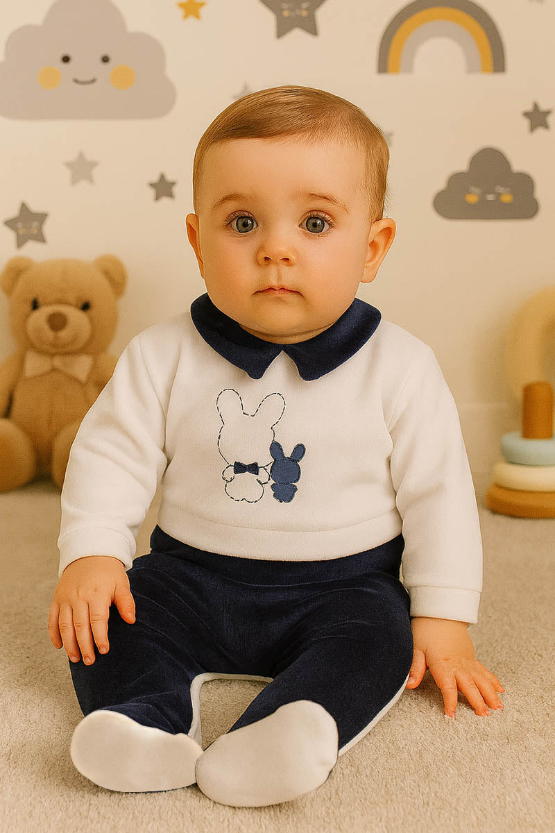 Tutina in ciniglia con ricamo ed inserti in contrasto