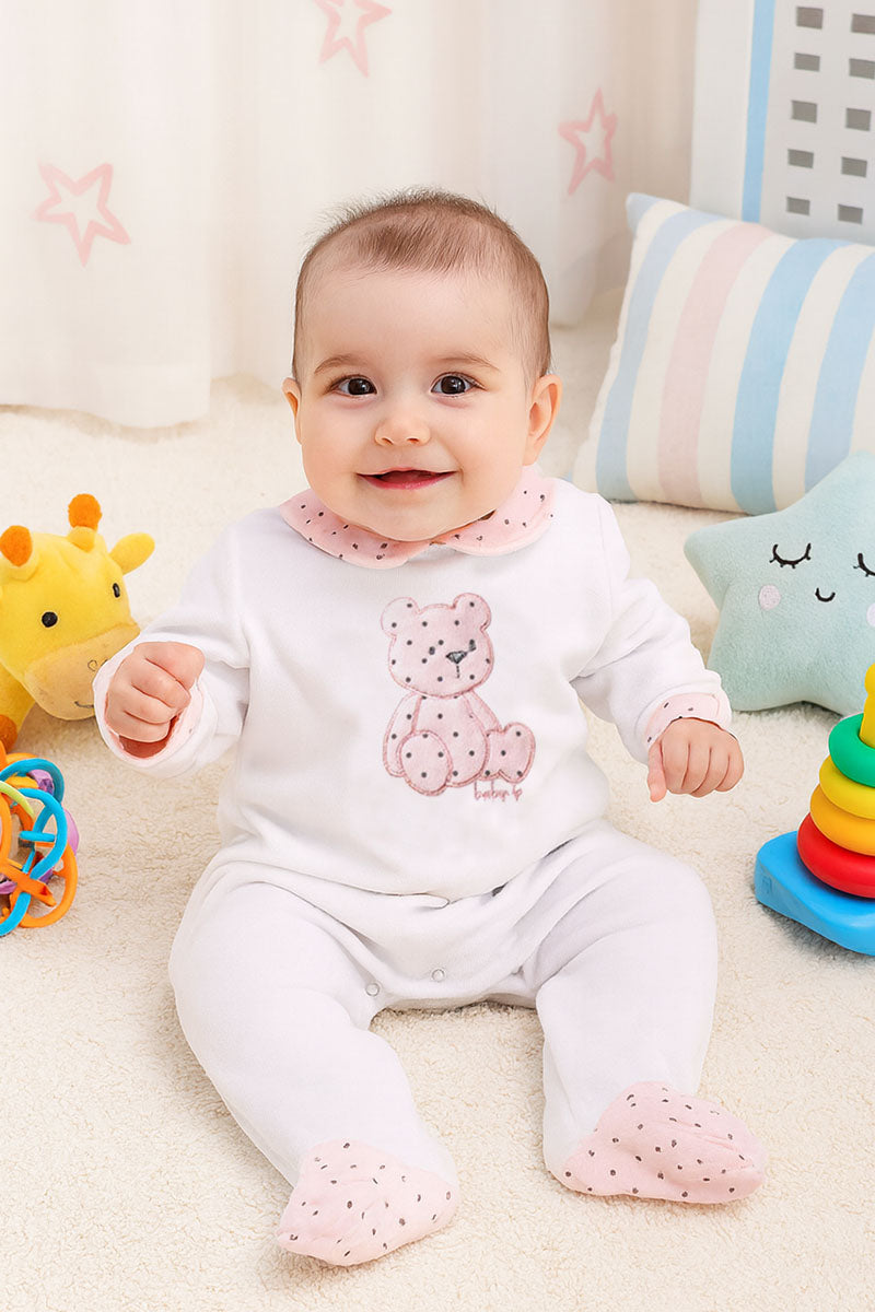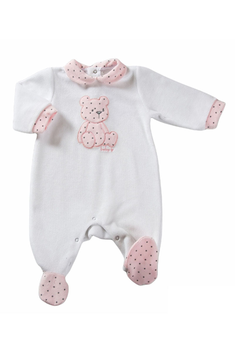 Tutina in ciniglia con ricamo ed inserti in contrasto fantasia a pois