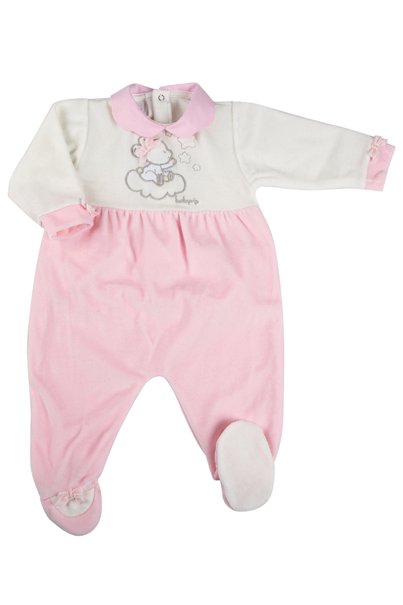 Tutina in ciniglia con ricamo, colletto smerlato e nodini in velluto
