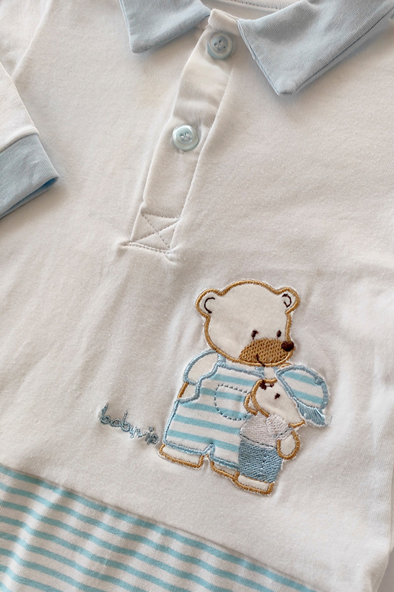 Tutina in cotone elasticizzato con inserti rigati e ricamo