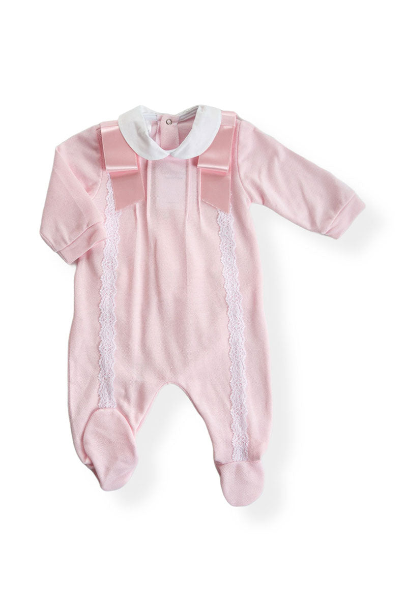 Tutina in piquet con pieghette, pizzo applicato e fiocchi in raso su spalla