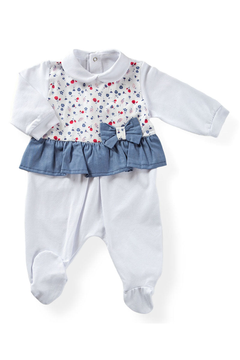 Tutina in cotone elasticizzato con inserto in tela fantasia floreale, fiocco e balza in tela jeans