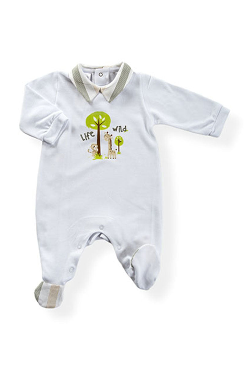 Tutina in piquet con stampa ed inserti in tessuto effetto lino rigato