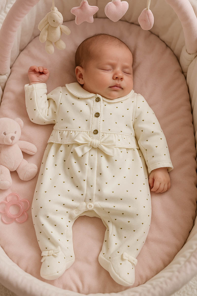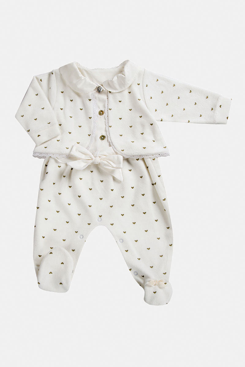 Tutina in ciniglia con cuoricini oro e inserti in tela