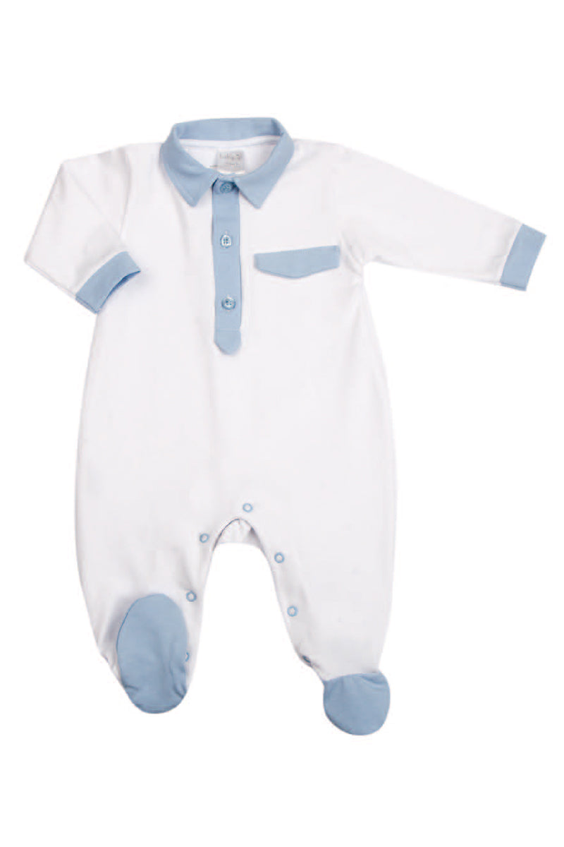• Con fenda e taschino coordinati su tessuto cielo e bianco.