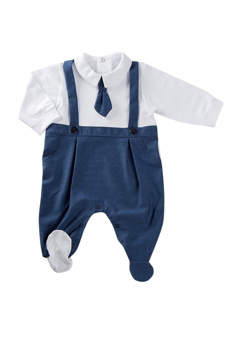 Tutina in tela operata e tela microfantasia con bretelle e cravattino applicati