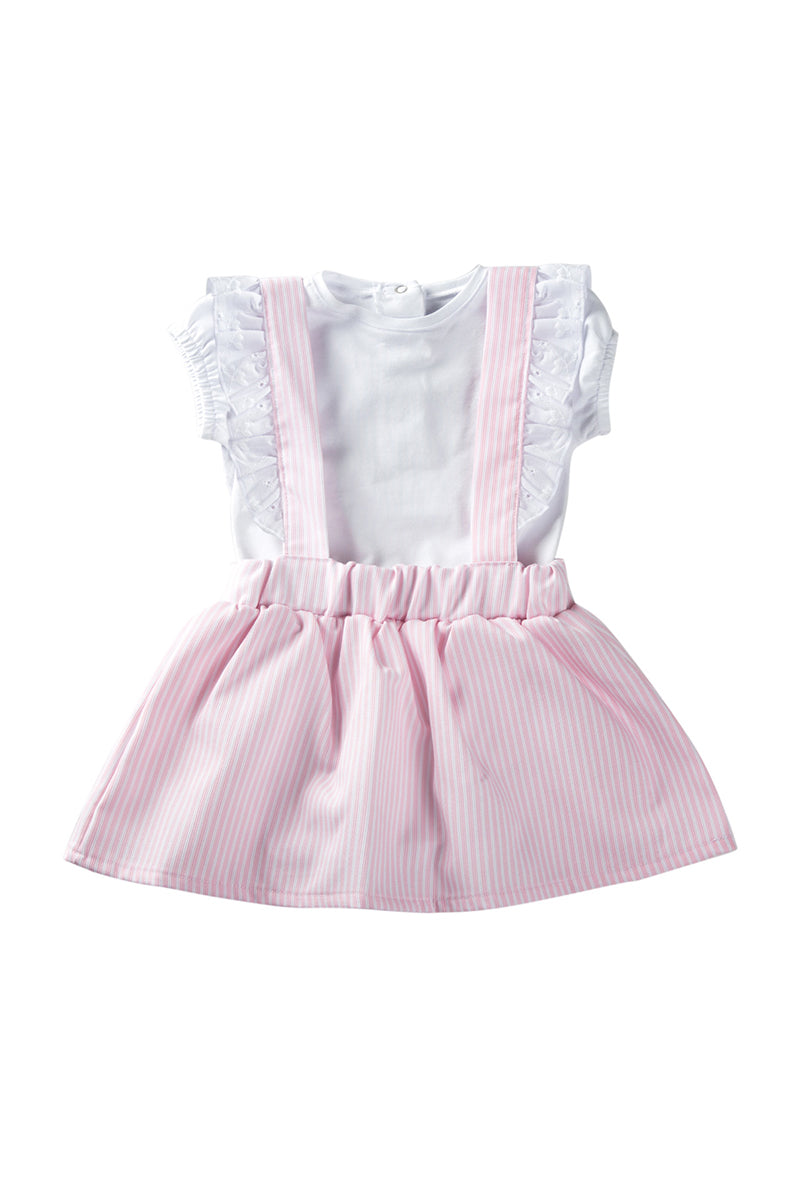 Vestitino con bretelle in tela navetta rigata con balze in tela sangallo e body