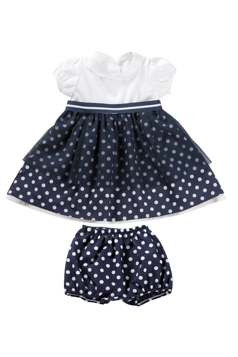 Vestitino con inserto a pois, balza in tulle, nastro rigato e mutandina a pois