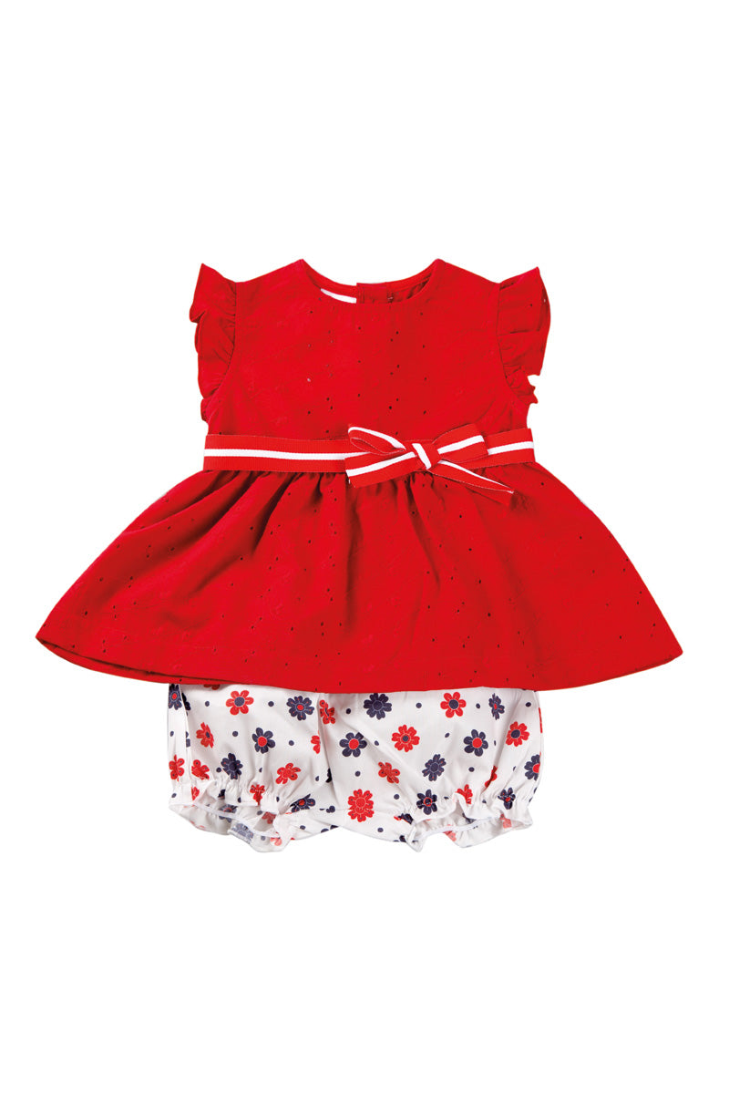 Vestitino in sangallo con nastro, fiocco e pantaloncino fantasia floreale