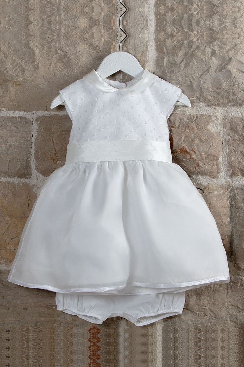 Vestitino in tela di cotone con inserto organza con pois in rilievo cintura in tessuto annodabile sul retro con fiocco