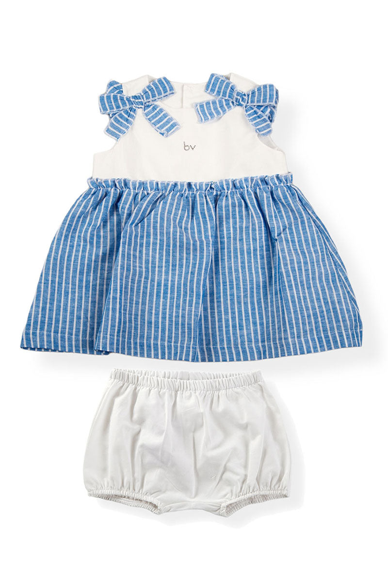 Vestitino in tela di cotone con strass, fiocchi su spalla e inserto in tessuto effetto lino rigato e mutandina abbinata