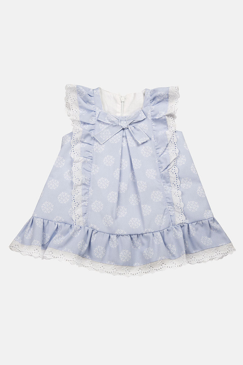 Vestitino in tela di cotone a navetta fantasia con balze, pizzo applicato e fiocco