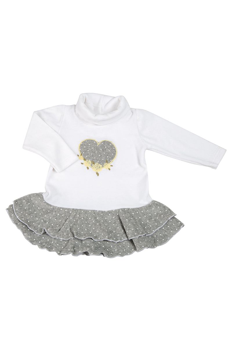 Vestitino manica lunga in ciniglia con collo alto, ricamo cuore e balze a pois