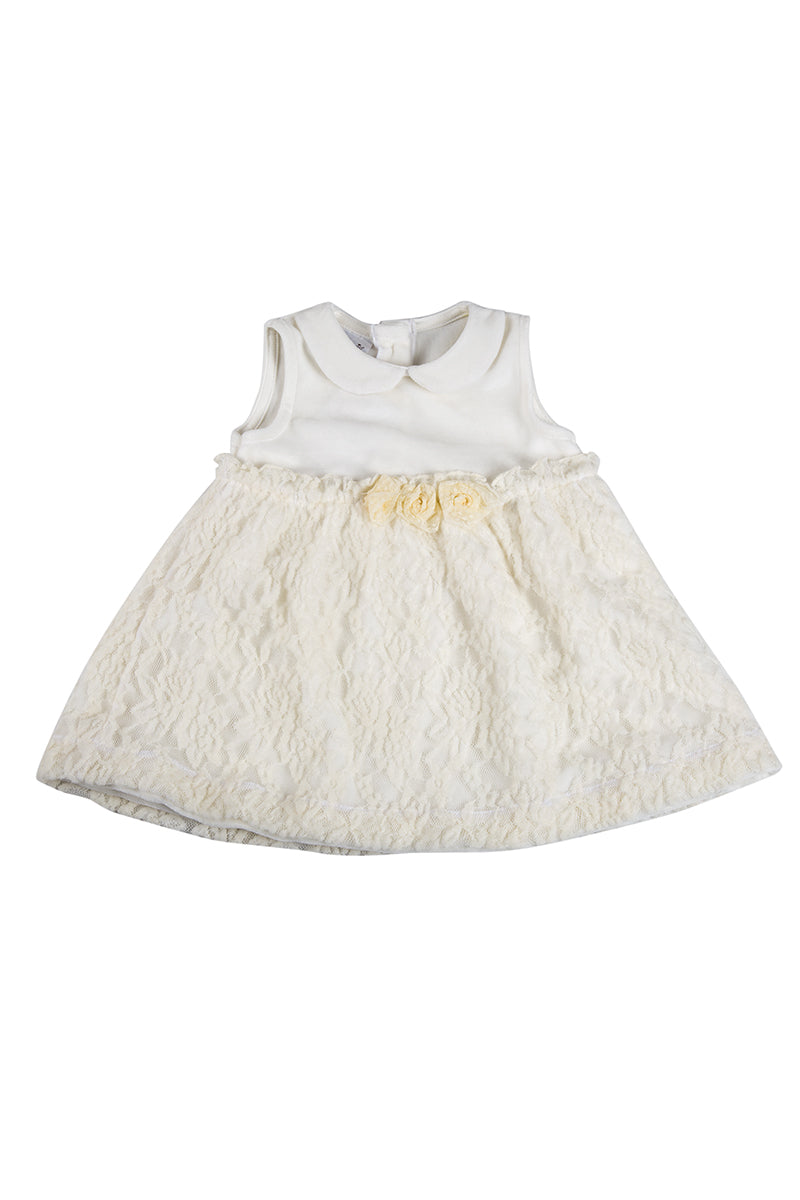Vestitino smanicato in ciniglia con inserto in pizzo lanoso e roselline applicate