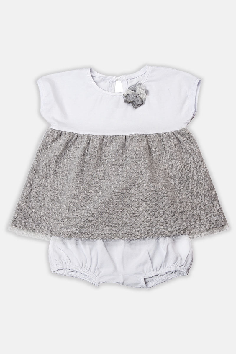 Vestitino in cotone elasticizzato con inserti in tulle a pois e rosellina + mutandina in cotone elasticizzato