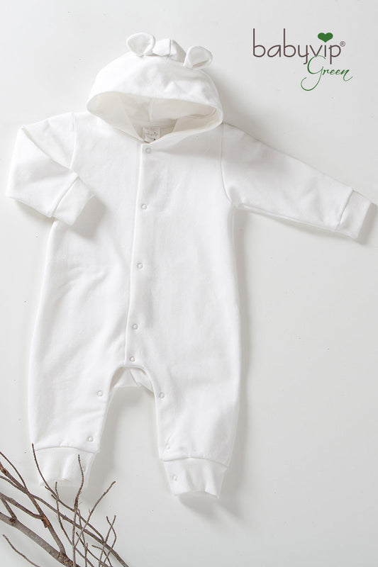 Tutone in felpa organica garzata con cappuccio, orecchie in tessuto e apertura anteriore