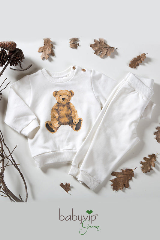 Completo 2 pezzi neonato in felpa organica garzata con stampa orsetto e bottoni su spalla in contrasto